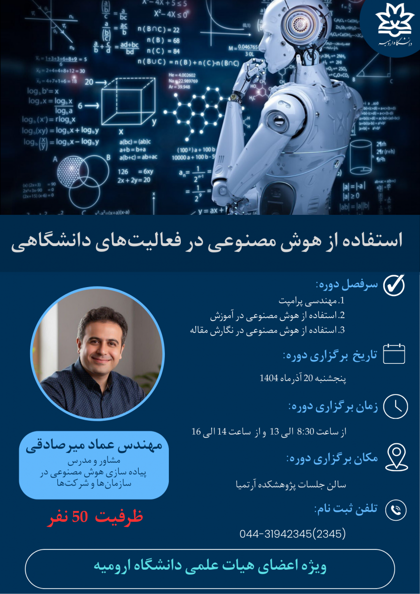 اطلاعیه برگزاری دوره دانشافزایی و توانمندسازی اعضای هیاتعلمی - پاییز 1404 جهت مشاهده اطلاعیه برگزاری دوره دانشافزایی و توانمندسازی اعضای هیاتعلمی - پاییز 1404 لطفا کلیک نمایید. ارسال شده توسط : s.hassanbaglou در تاریخ : شنبه, آذر 8, 1404 - 08:52تعداد مشاهده:130